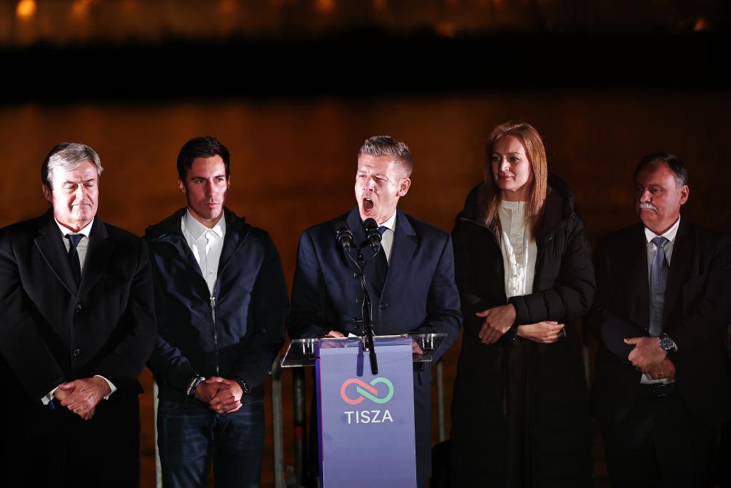 4月12日,在匈牙利首都布達(dá)佩斯,匈牙利蒂薩黨領(lǐng)導(dǎo)人毛焦?fàn)枴け说茫ㄖ校┰趧龠x晚會上講話。新華社發(fā)(鮑洛格·達(dá)維德攝)