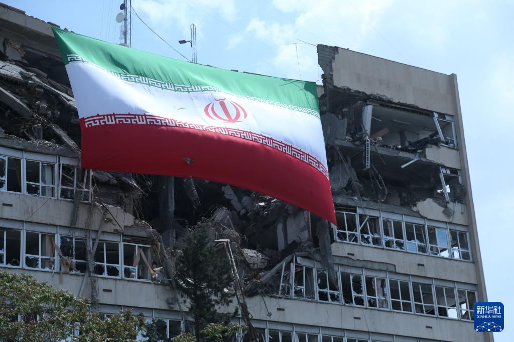 4月20日,在伊朗首都德黑蘭,伊朗國旗懸掛在遭美以襲擊被嚴重損毀的建筑上。
