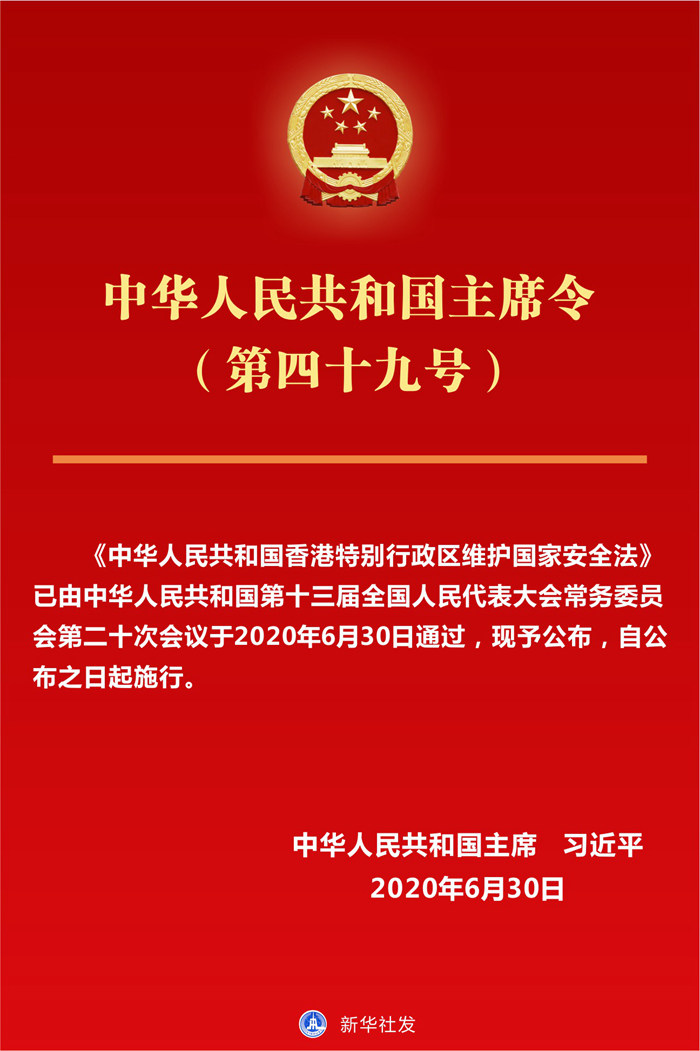 《中華人民共和國香港特別行政區(qū)維護(hù)國家安全法》已由中華人民共和國第十三屆全國人民代表大會常務(wù)委員會第二十次會議于2020年6月30日通過,現(xiàn)予公布,自公布之日起施行。