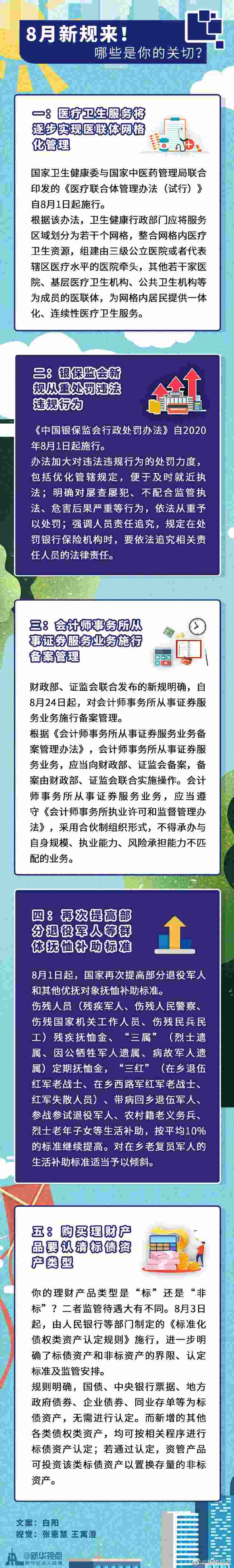 居民看病將逐步實現(xiàn)醫(yī)聯(lián)體網(wǎng)格化服務(wù)、銀保監(jiān)會新規(guī)進(jìn)一步提升金融違法違規(guī)成本、部分退役軍人和其他優(yōu)撫對象撫恤補助標(biāo)準(zhǔn)再次提高……這個8月,又有一批新規(guī)開始施行,影響你我的生活。