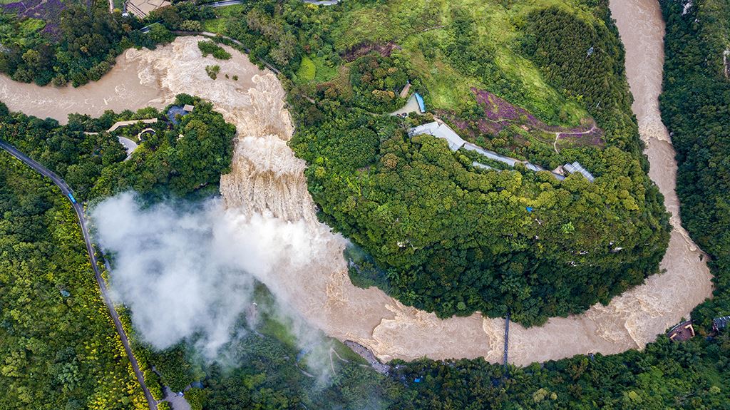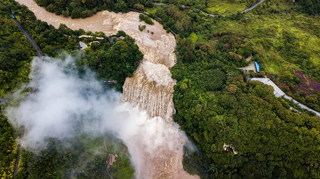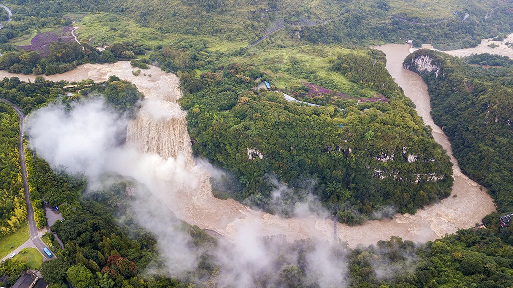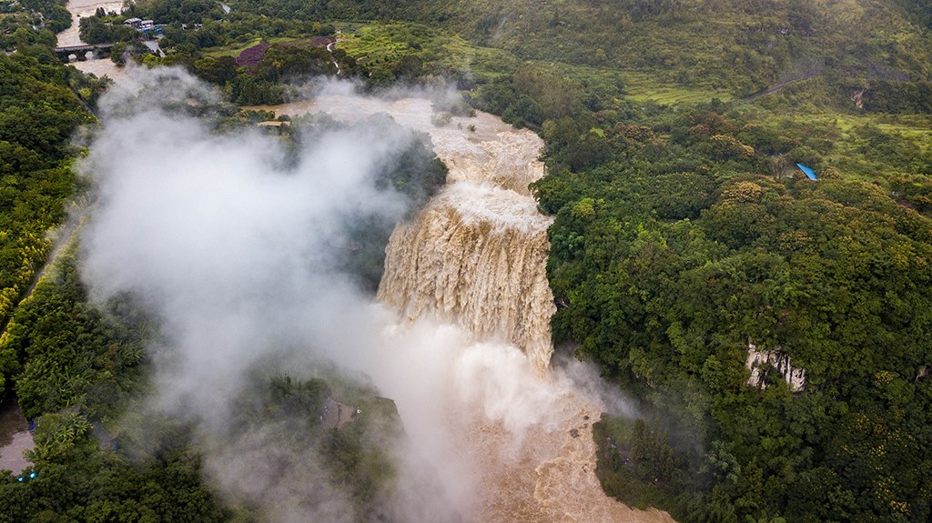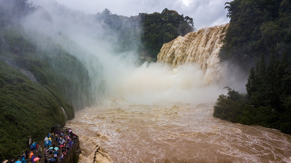 受強(qiáng)降雨影響,貴州黃果樹瀑布迎來2020年入汛以來最大水量,黃果樹瀑布水勢(shì)磅礴。陳熙/攝