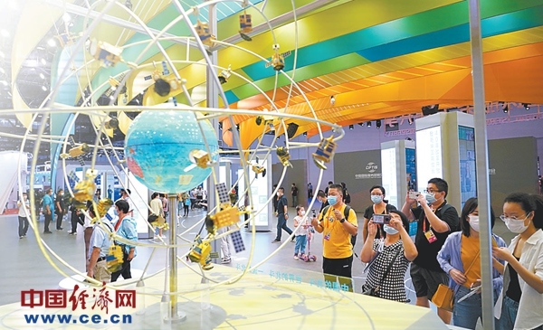 9月5日,觀眾在2020服貿(mào)會(huì)綜合展區(qū)觀看北斗衛(wèi)星模型。經(jīng)濟(jì)日?qǐng)?bào)-中國經(jīng)濟(jì)網(wǎng)記者趙晶攝