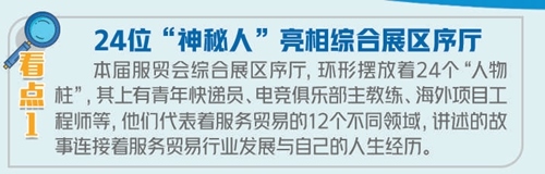 穿過展示屏區(qū)域,可以看到24根“人物柱”,上面展示著來自服務(wù)貿(mào)易十二大領(lǐng)域“行業(yè)故事講述人”的工作和生活故事。