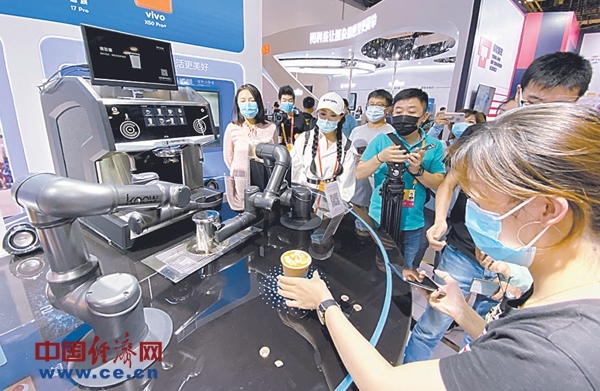 在綜合展區(qū)高通展臺(tái),觀眾們排隊(duì)體驗(yàn)機(jī)器人制作的拉花咖啡。經(jīng)濟(jì)日?qǐng)?bào)-中國經(jīng)濟(jì)網(wǎng)記者袁勇攝
