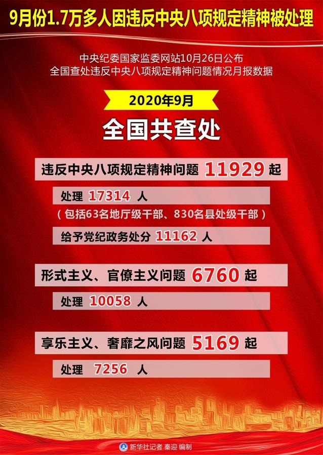 新華社北京10月26日電(記者朱基釵、孫少龍)中央紀(jì)委國家監(jiān)委網(wǎng)站26日公布全國查處違反中央八項規(guī)定精神問題情況月報數(shù)據(jù)。通報顯示,2020年9月,全國共查處違反中央八項規(guī)定精神問題11929起,處理17314人(包括63名地廳級干部、830名縣處級干部),給予黨紀(jì)政務(wù)處分11162人。