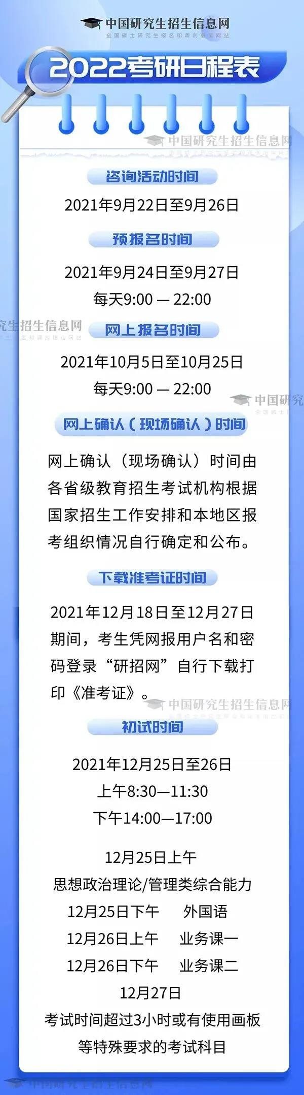 根據《2022年全國碩士研究生招生工作管理規(guī)定》,2022年研考網上報名時間為2021年10月5日至10月25日。網上預報名時間為2021年9月24日至9月27日。
