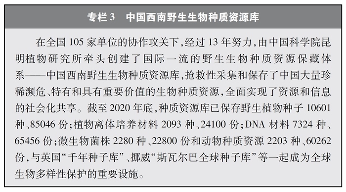 加快重要生物遺傳資源收集保存和利用。中國(guó)高度重視生物資源保護(hù),近年來在生物資源調(diào)查、收集、保存等方面取得較大進(jìn)展。實(shí)施戰(zhàn)略生物資源計(jì)劃專項(xiàng),完善生物資源收集收藏平臺(tái),建立種質(zhì)資源創(chuàng)新平臺(tái)、遺傳資源衍生庫(kù)和天然化合物轉(zhuǎn)化平臺(tái),持續(xù)加強(qiáng)野生生物資源保護(hù)和利用。實(shí)施一批種質(zhì)資源保護(hù)和育種創(chuàng)新項(xiàng)目,截至2020年底,形成了以國(guó)家作物種質(zhì)長(zhǎng)期庫(kù)及其復(fù)份庫(kù)為核心、10座中期庫(kù)與43個(gè)種質(zhì)圃為支撐的國(guó)家作物種質(zhì)資源保護(hù)體系,建立了199個(gè)國(guó)家級(jí)畜禽遺傳資源保種場(chǎng)(區(qū)、庫(kù)),為90%以上的國(guó)家級(jí)畜禽遺傳資源保護(hù)名錄品種建立了國(guó)家級(jí)保種單位,長(zhǎng)期保存作物種質(zhì)資源52萬余份、畜禽遺傳資源96萬份。建設(shè)99個(gè)國(guó)家級(jí)林木種質(zhì)資源保存庫(kù),以及新疆、山東2個(gè)國(guó)家級(jí)林草種質(zhì)資源設(shè)施保存庫(kù)國(guó)家分庫(kù),保存林木種質(zhì)資源4.7萬份。建設(shè)31個(gè)藥用植物種質(zhì)資源保存圃和2個(gè)種質(zhì)資源庫(kù),保存種子種苗1.2萬多份。