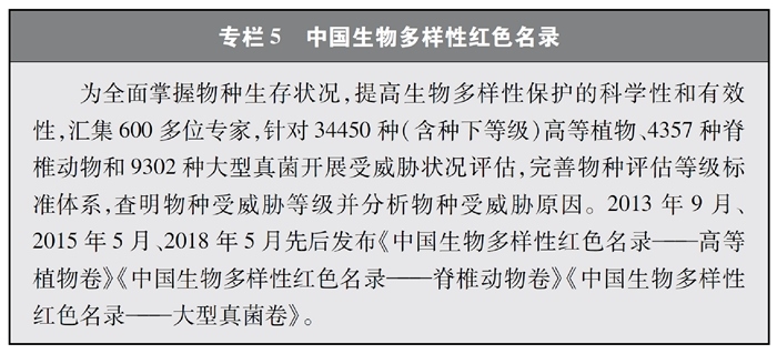 開展全國(guó)生物多樣性調(diào)查與評(píng)估。大力推進(jìn)生物多樣性保護(hù)重大工程實(shí)施,結(jié)合自然資源調(diào)查、生態(tài)系統(tǒng)監(jiān)測(cè)評(píng)估等工作,不斷完善生物多樣性調(diào)查與評(píng)估能力,首次將生物多樣性指標(biāo)納入生態(tài)質(zhì)量綜合評(píng)價(jià)指標(biāo)體系,引導(dǎo)地方加強(qiáng)生態(tài)文明建設(shè)與生物多樣性保護(hù)。開展自然資源調(diào)查,包括森林、草原、水、濕地、荒漠、海洋等,建立自然資源調(diào)查評(píng)價(jià)監(jiān)測(cè)制度。構(gòu)建了涵蓋2376個(gè)縣級(jí)行政單元、樣線總長(zhǎng)超過3.4萬公里的物種分布數(shù)據(jù)庫(kù),建立物種資源調(diào)查及收集信息平臺(tái),準(zhǔn)確反映野生動(dòng)植物空間分布狀況。完成長(zhǎng)江經(jīng)濟(jì)帶、京津冀等國(guó)家戰(zhàn)略區(qū)域180多個(gè)縣級(jí)行政區(qū)生物多樣性調(diào)查與評(píng)估。組織開展近海漁業(yè)資源調(diào)查,初步掌握近海漁業(yè)資源狀況。陸續(xù)發(fā)布《中國(guó)植物紅皮書》《中國(guó)瀕危動(dòng)物紅皮書》《中國(guó)物種紅色名錄》《中國(guó)生物多樣性紅色名錄》,基本掌握生物多樣性總體情況,為加強(qiáng)生物多樣性保護(hù)奠定了科學(xué)基礎(chǔ)。