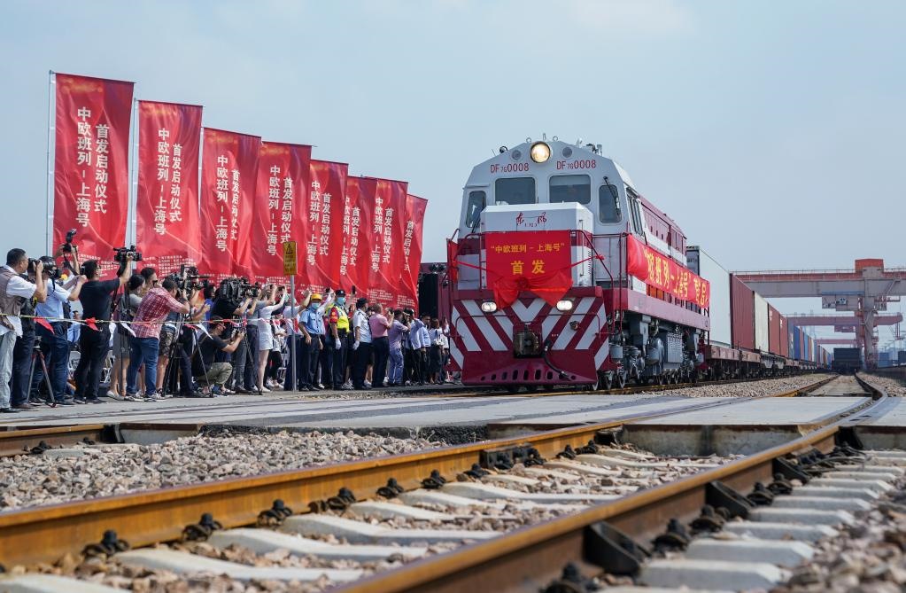 “上海號”中歐班列從上海首發(fā),駛向德國漢堡(2021年9月28日攝)。(新華社記者丁汀攝)