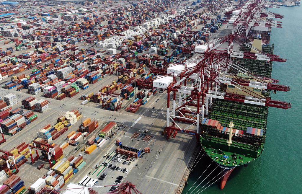 載箱量可達2.4萬標準箱的“現(xiàn)代商船阿爾赫西拉斯”輪靠泊在青島港前灣碼頭(2020年4月26日攝,無人機照片)。(新華社記者李紫恒攝)