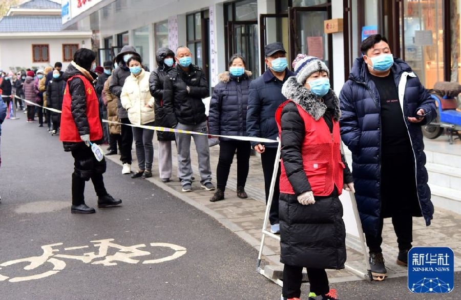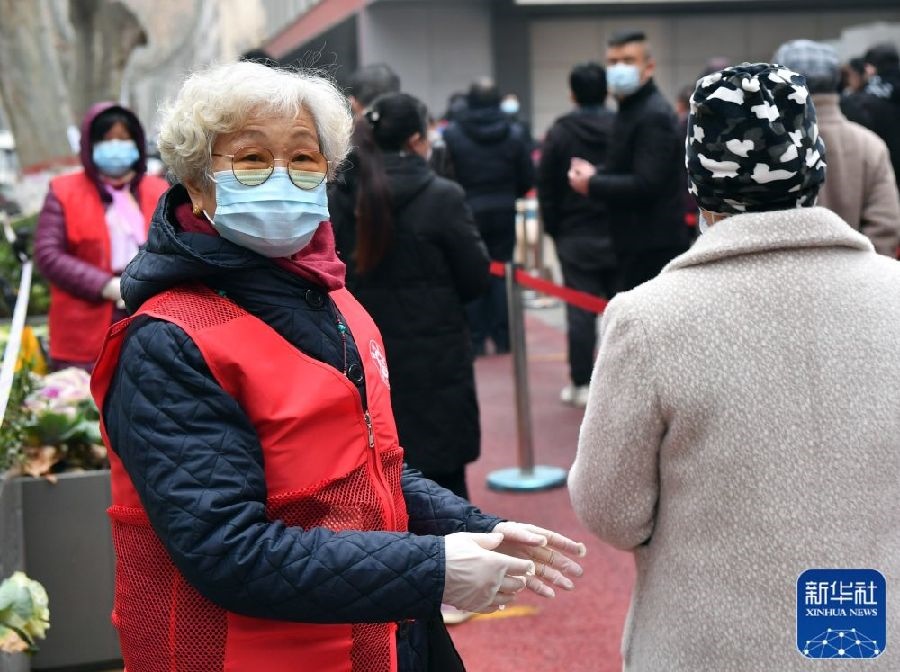 1月7日,在鄭州市經(jīng)八路辦事處一處檢測點,75歲的志愿者耿小娣(左)在引導市民排隊。新華社記者李嘉南攝
