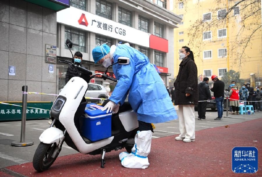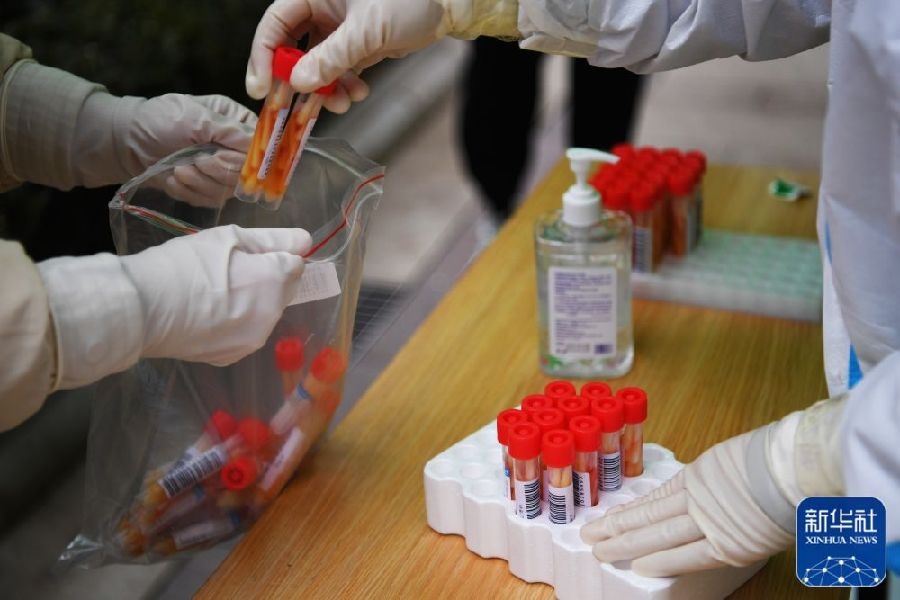1月10日,在鄭州市緯一路核酸檢測點,醫(yī)護人員在封裝核酸樣本箱,準備送檢。新華社記者郝源攝