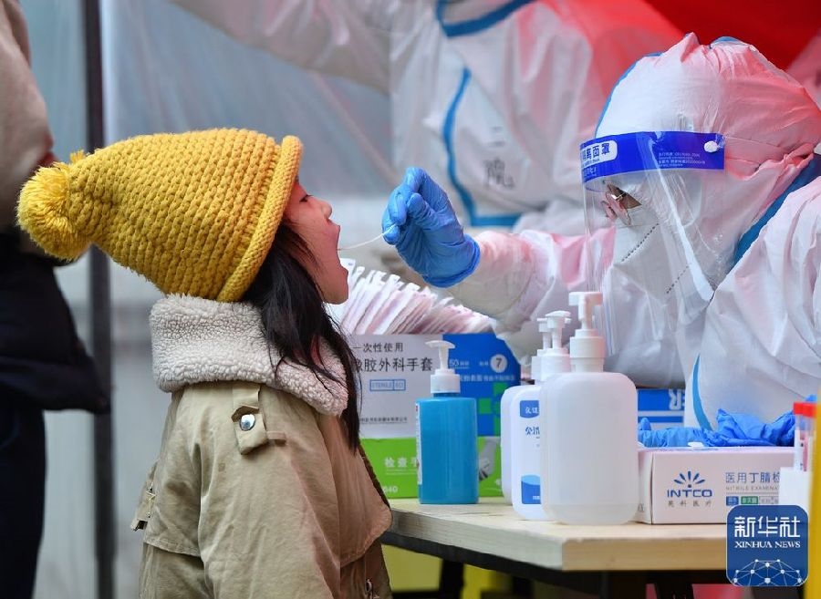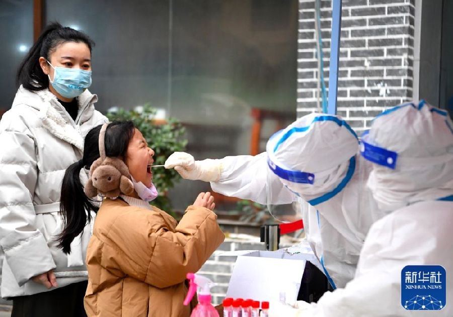 1月10日,在鄭州市二七區(qū)政通路一處核酸檢測點,醫(yī)務人員為小朋友進行核酸檢測取樣。新華社發(fā)(丁友明攝)