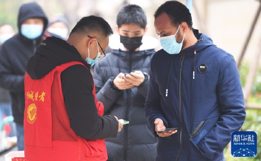 1月10日,在鄭州市高新區(qū)楓楊辦事處譽園核酸檢測點,志愿者幫助外籍人員掃碼登記。新華社記者張浩然攝