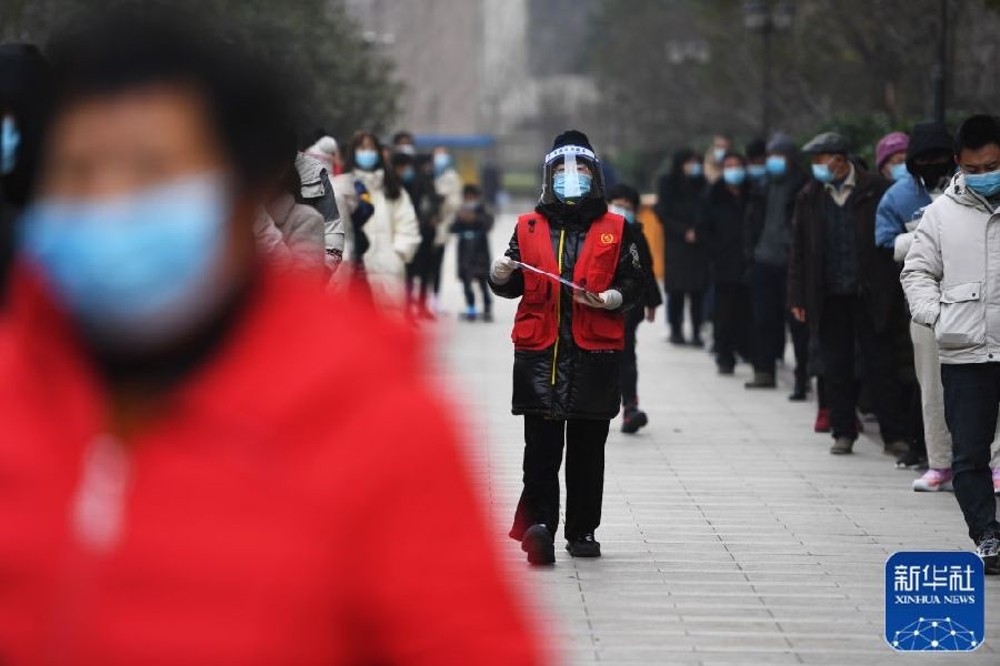 1月7日,志愿者在鄭州市經(jīng)五路檢測點引導市民排隊,準備進行核酸檢測采樣。新華社記者朱祥攝
