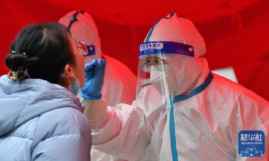 1月10日,在鄭州市二七區(qū)政通路一處核酸檢測點,醫(yī)務人員為市民進行核酸檢測取樣。新華社發(fā)(丁友明攝)