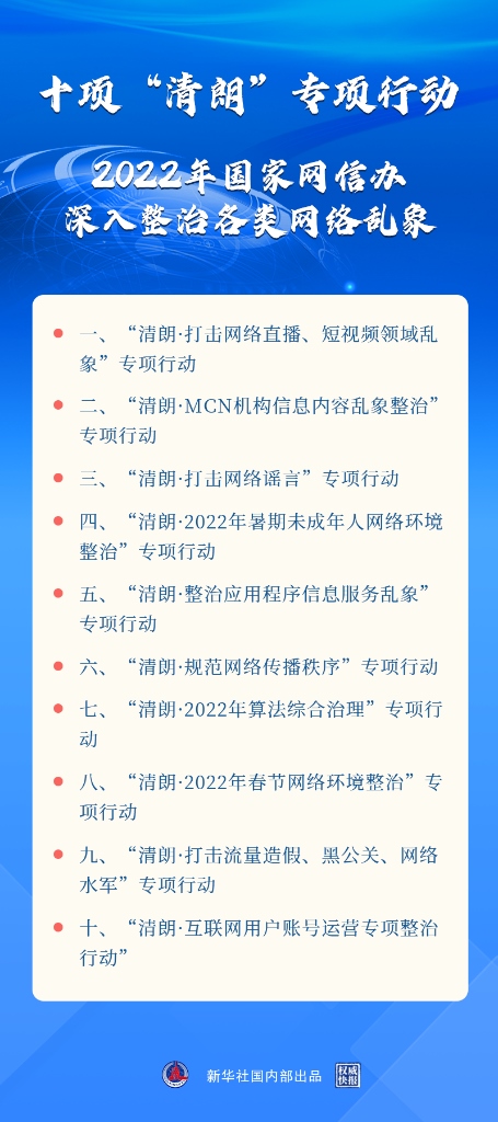 新華社北京3月17日電(記者王思北)記者17日從國新辦舉行的新聞發(fā)布會(huì)獲悉,2022年“清朗”系列專項(xiàng)行動(dòng)將重點(diǎn)開展打擊網(wǎng)絡(luò)謠言,打擊網(wǎng)絡(luò)直播、短視頻領(lǐng)域亂象,算法綜合治理,暑期未成年人網(wǎng)絡(luò)環(huán)境整治等十方面任務(wù)?! ?/p>