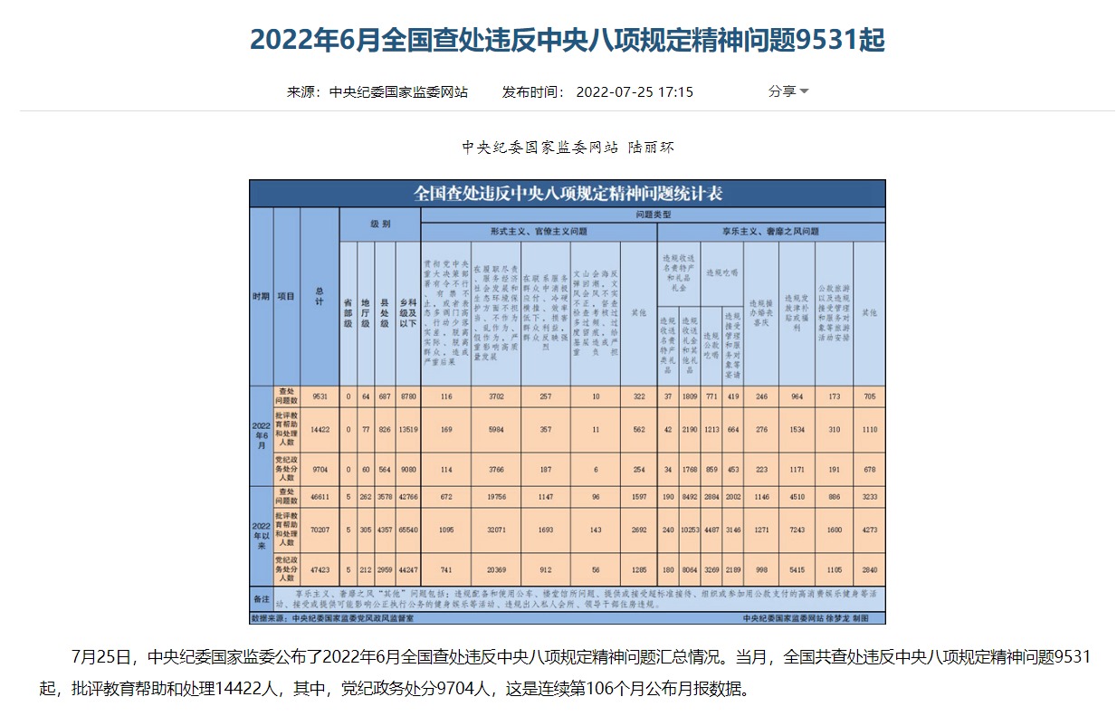 從公布的月報數(shù)據(jù)看,當月(6月),全國共查處違反中央八項規(guī)定精神問題9531起,批評教育幫助和處理14422人,其中,黨紀政務(wù)處分9704人。