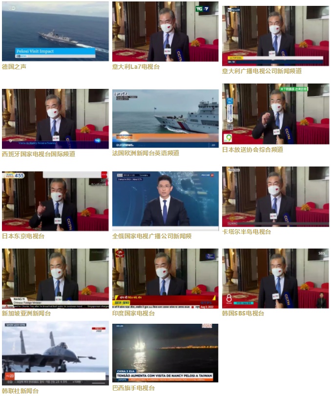 總臺亞非中心制作的外交部、全國人大常委會、中共中央臺灣工作辦公室、全國政協(xié)外事委員會、國防部、東部戰(zhàn)區(qū)、王毅國務委員兼外長發(fā)表的相關聲明和談話得到了日本、韓國、印度、土耳其、印尼、伊朗等對象國250多家主流媒體轉載近5000篇次。