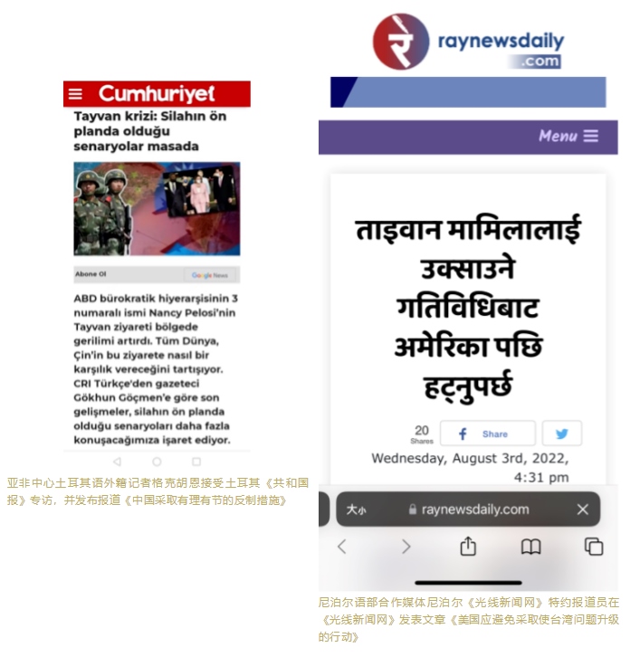 亞非中心土耳其、希伯來語、豪薩語、尼泊爾語、蒙古語等多語種主播、評論員和網(wǎng)紅積極在多家外媒發(fā)聲,接受了包括以色列電視臺、土耳其AHABER新聞臺、土耳其TGRT電視臺、土耳其新聞電視臺等多家國際媒體的采訪連線,同時多名外籍記者、海外特約評論員在尼日利亞《領導者報》網(wǎng)站、尼泊爾《光線新聞網(wǎng)》、肯尼亞《人民報》、蒙古國媒體SONIN.MN等對象國主流媒體發(fā)表評論及署名文章,對外闡釋中方立場和反制措施的合理性、正當性,介紹臺灣問題歷史經緯,揭批美國在臺灣問題上的背信棄義。