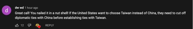 網(wǎng)友dw wd:“精彩的一期視頻!你簡潔而清晰地呈現(xiàn)了內容,如果美國真的想選擇與臺灣建立所謂的‘外交關系’,他們首先需要與中國斷交?!?/p>