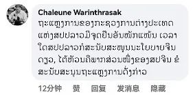 老撾新聞文化旅游部前副部長扎倫·瓦林塔薩(Chaleune Warinthrasak)留言:“老撾外交部的聲明及時而嚴正,任何時候我們只支持一個中國原則,臺灣是中國不可分割的一部分?!?/p>