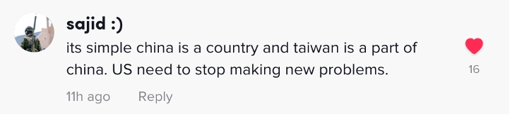 網(wǎng)友sajid:“真相很簡單,臺灣是中國的一部分,美國須停止給世界帶來新的麻煩。”