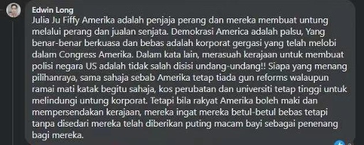 馬來西亞網(wǎng)友Edwin Long留言:“美國就是戰(zhàn)爭販子,他們通過戰(zhàn)爭和販賣武器獲利。美國的民主只是假象,真正享有權力和自由的是在幕后主導國會的大企業(yè)。換句話說,官商勾結在美國的法律上是被允許的!無論誰贏得選舉,一樣不會禁槍,醫(yī)療和教育成本還是不會下降,因為要維護大企業(yè)的利益。但是他們的人民覺得他們能罵政府就是自由的,全然沒有意識到這不過是安撫奶嘴罷了?!?/p>