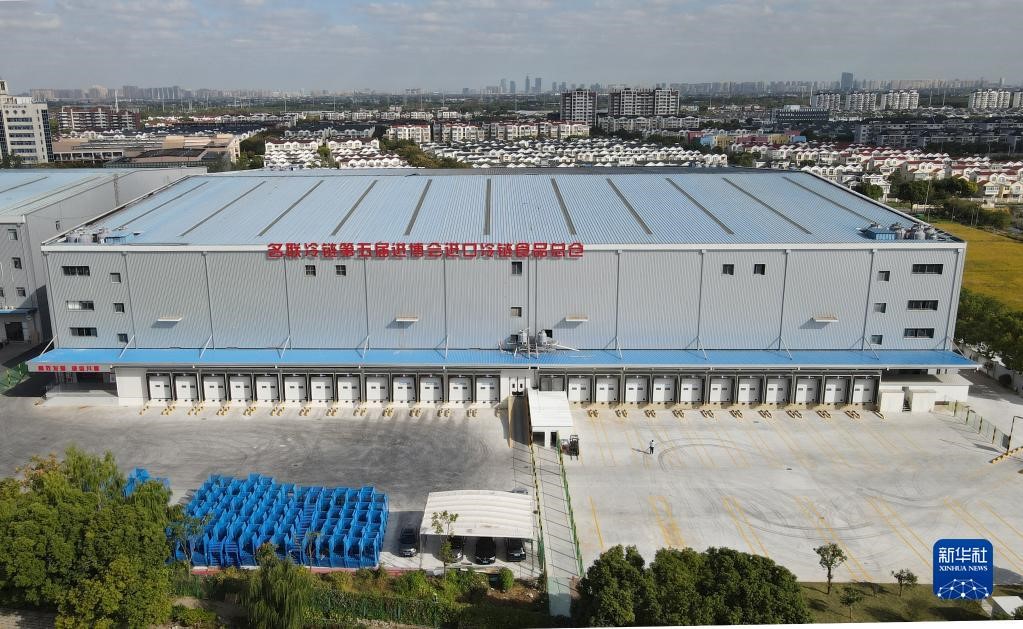 10月20日,空中俯瞰位于上海青浦區(qū)的名聯(lián)冷鏈第五屆進(jìn)博會(huì)進(jìn)口冷鏈?zhǔn)称房倐}(cāng)(無(wú)人機(jī)照片)。新華社記者 方喆攝