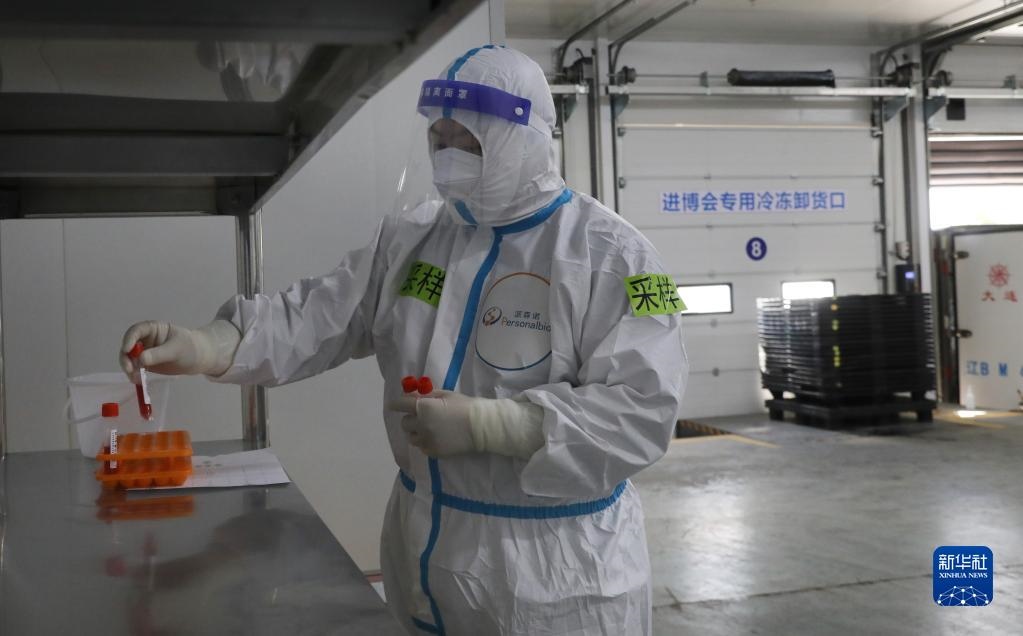10月20日,一名核酸采樣工作人員在放置入倉(cāng)的冷鏈?zhǔn)称氛蛊泛怂針颖?。新華社記者 方喆攝