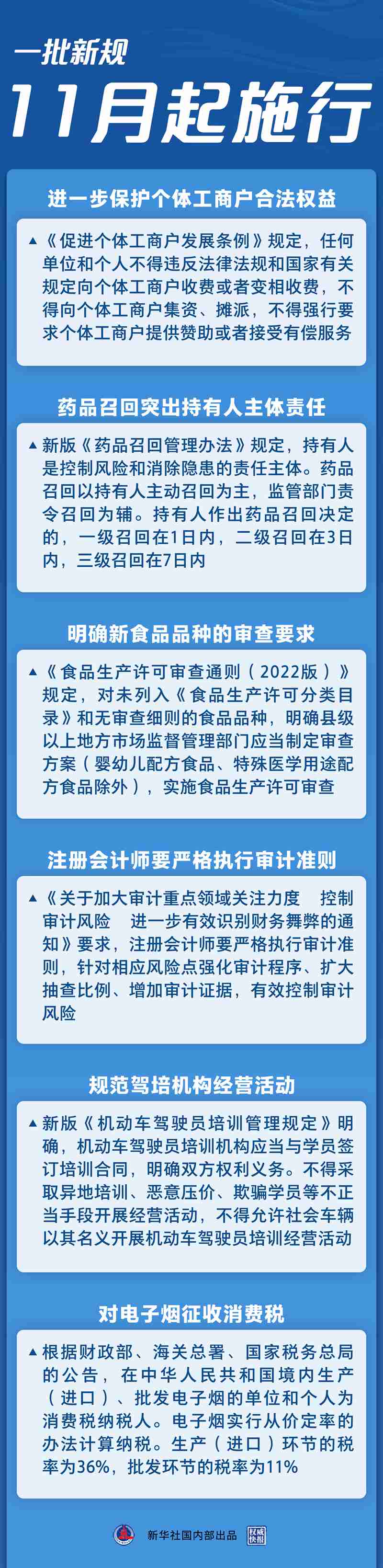 這個(gè)11月,一批民生新規(guī)開始施行,影響社會生活諸多方面。保護(hù)個(gè)體工商戶合法權(quán)益、規(guī)范駕培機(jī)構(gòu)經(jīng)營活動、完善藥品召回分級制度……更完善的法治,讓你我更有獲得感。