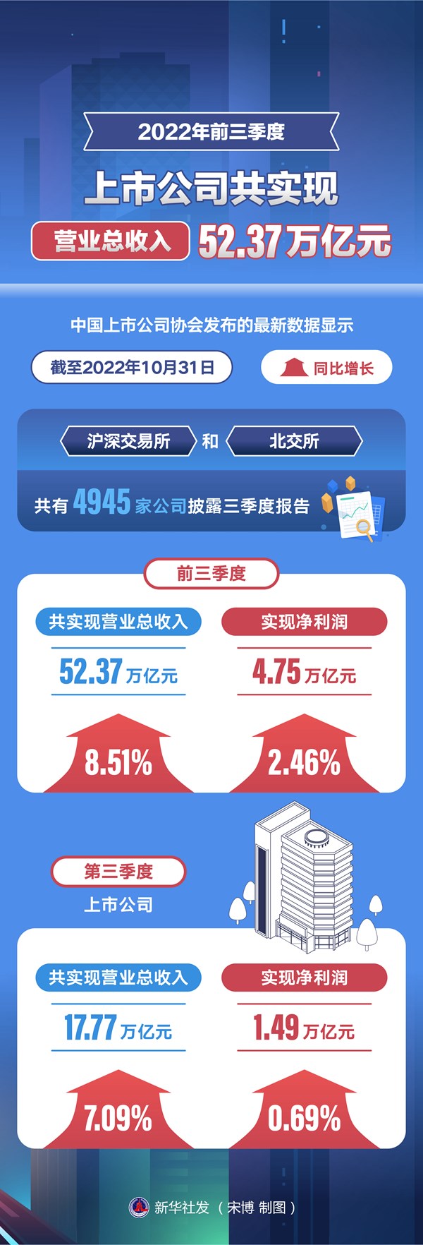 新華社北京11月1日電(記者 姚均芳)中國上市公司協(xié)會發(fā)布的最新數(shù)據(jù)顯示,截至2022年10月31日,滬深交易所和北交所共有4945家公司披露三季度報告,前三季度共實現(xiàn)營業(yè)總收入52.37萬億元,同比增長8.51%;實現(xiàn)凈利潤4.75萬億元,同比增長2.46%。