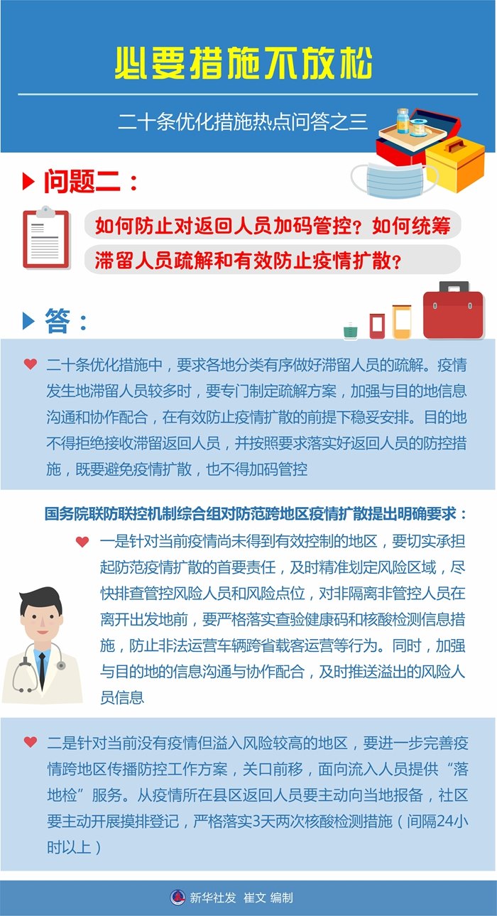 答:二十條優(yōu)化措施中,要求各地分類(lèi)有序做好滯留人員的疏解。疫情發(fā)生地滯留人員較多時(shí),要專(zhuān)門(mén)制定疏解方案,加強(qiáng)與目的地信息溝通和協(xié)作配合,在有效防止疫情擴(kuò)散的前提下穩(wěn)妥安排。目的地不得拒絕接收滯留返回人員,并按照要求落實(shí)好返回人員的防控措施,既要避免疫情擴(kuò)散,也不得加碼管控。
