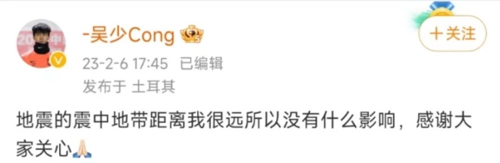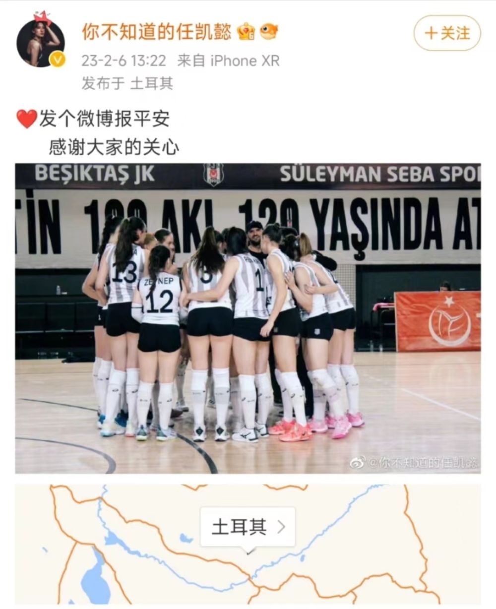 新華社北京2月7日電 土耳其發(fā)生強(qiáng)烈地震后,效力于土耳其職業(yè)聯(lián)賽的中國女足運(yùn)動(dòng)員李佳悅、男足運(yùn)動(dòng)員吳少聰,以及女排運(yùn)動(dòng)員任凱懿先后在社交媒體平臺上報(bào)平安。