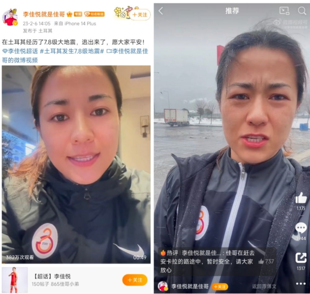今年1月,李佳悅從上海農(nóng)商銀行女足轉(zhuǎn)會土耳其加拉塔薩雷女足。她6日于個(gè)人社交媒體賬號上發(fā)布兩條視頻,表示地震發(fā)生前自己正隨隊(duì)在震中附近區(qū)域比賽,目前,她正在趕往土耳其首都安卡拉的途中。