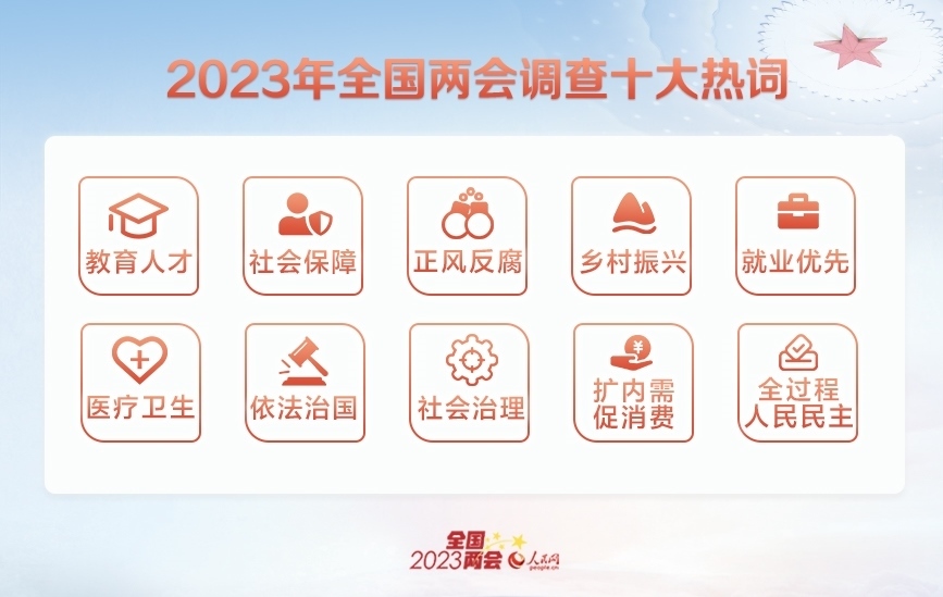 經(jīng)過網(wǎng)友投票,“教育人才”“社會保障”“正風反腐”“鄉(xiāng)村振興”“就業(yè)優(yōu)先”“醫(yī)療衛(wèi)生”“依法治國”“社會治理”“擴內(nèi)需促消費”“全過程人民民主”入選十大熱詞。