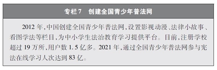 加強青少年網(wǎng)絡(luò)法治宣傳教育。青少年是祖國的未來、民族的希望。青少年網(wǎng)民在中國網(wǎng)民中的占比逐步增長。作為互聯(lián)網(wǎng)的“原住民”,青少年是網(wǎng)上學(xué)習(xí)、交流、生活最活躍的參與者、實踐者,其合法權(quán)益也更易受到網(wǎng)絡(luò)違法活動的侵害。中國從保護青少年網(wǎng)絡(luò)權(quán)益,促進青少年健康成長、全面發(fā)展出發(fā),遵循青少年身心發(fā)展規(guī)律,貼近青少年學(xué)習(xí)生活實際,聚焦網(wǎng)絡(luò)沉迷、網(wǎng)絡(luò)欺凌、網(wǎng)絡(luò)淫穢色情信息等重點問題,通過普法微綜藝、兒童普法話劇、網(wǎng)絡(luò)普法故事廣播、網(wǎng)絡(luò)普法云課堂、學(xué)法用法知識競賽、法治副校長進校園、編寫網(wǎng)絡(luò)普法讀本等生動活潑、豐富多彩的形式開展法治宣傳教育,逐步形成了政府、社會、學(xué)校、家庭相結(jié)合的法治宣傳教育格局,為提升青少年網(wǎng)民法治意識和網(wǎng)絡(luò)安全素養(yǎng)提供了全面保障。