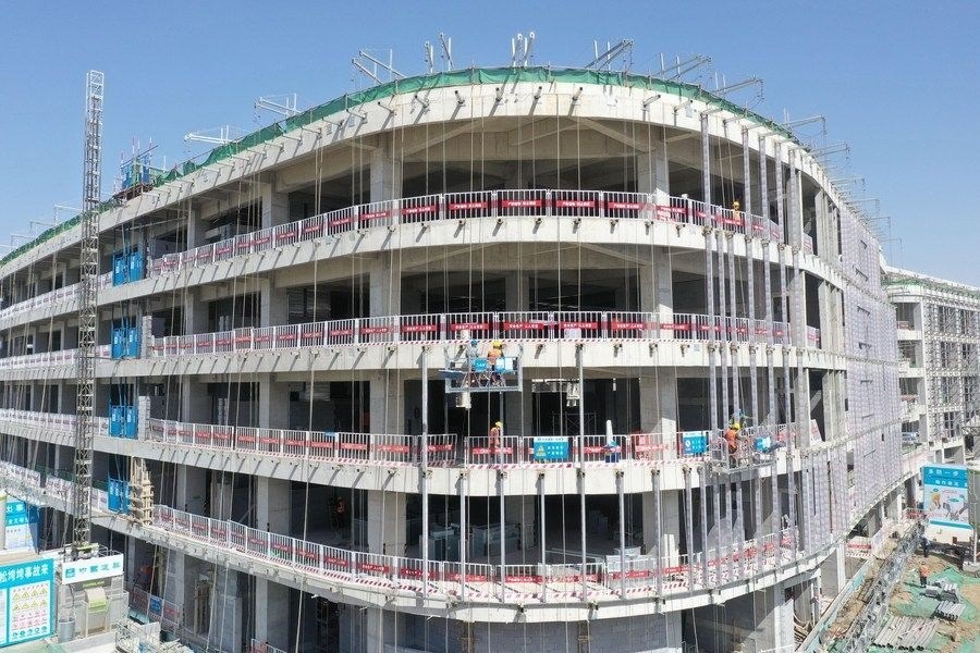 在雄安新區(qū)啟動(dòng)區(qū),工人在中國(guó)衛(wèi)星網(wǎng)絡(luò)集團(tuán)有限公司雄安總部施工現(xiàn)場(chǎng)作業(yè)(3月15日攝,無(wú)人機(jī)照片)。