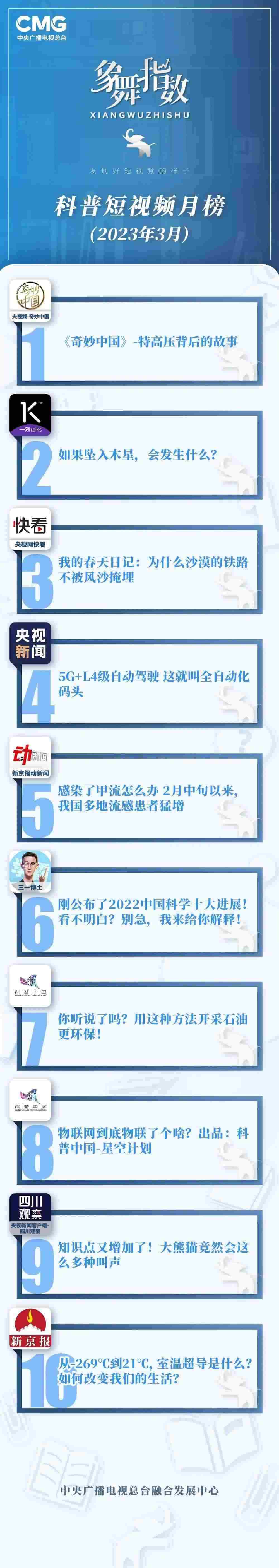 中央廣播電視總臺(tái)“象舞指數(shù)”評(píng)議品牌,推出科普短視頻月榜、總臺(tái)科普短視頻月榜。在2023年3月,值得注目的內(nèi)容有: