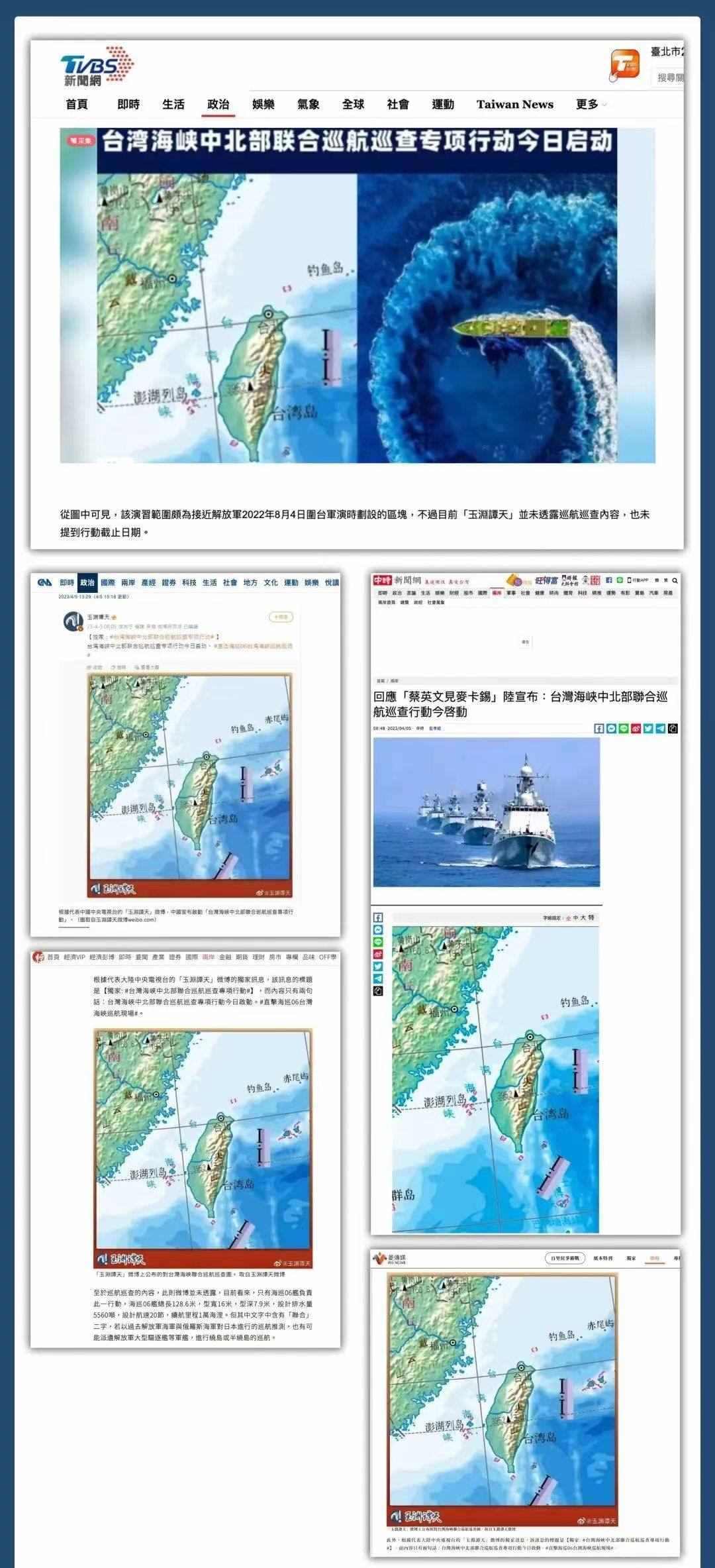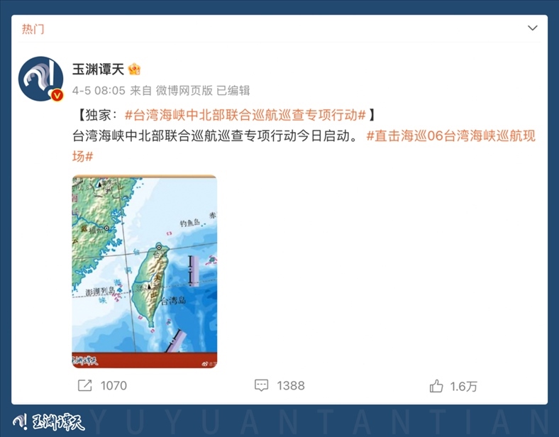 多家主流媒體轉(zhuǎn)發(fā)引用,消息瞬間傳遍全網(wǎng)。90余家臺灣媒體多平臺轉(zhuǎn)發(fā),揣測此次巡航活動及玉淵譚天配圖釋放的信號。臺當局就此消息進行緊急回應(yīng),美國之音也撰文評論。