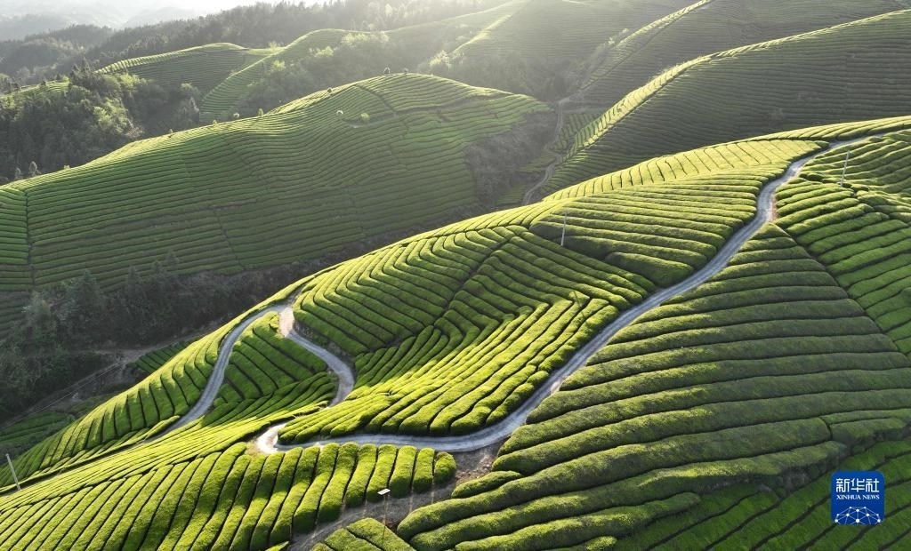 4月16日拍攝的鶴峰縣走馬鎮(zhèn)木耳山茶園(無人機(jī)照片)。