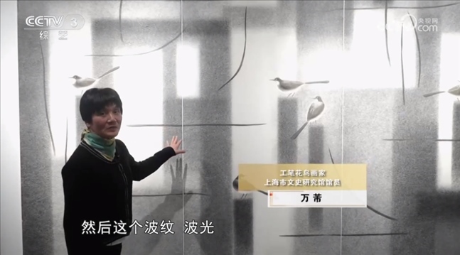 工筆花鳥畫家 上海市文史研究館館員 萬(wàn)芾:我們看到水泥柱子嘛,方的,這個(gè)波紋我是用山水畫里的披麻皴的皴法,形成水光瀲滟的效果,畫面也是用了一個(gè)比較抽象的點(diǎn)線面的元素來(lái)處理的,追求還是中國(guó)傳統(tǒng)繪畫里的氣韻生動(dòng),只是整個(gè)畫面第一感覺(jué)的形式讓人現(xiàn)代的感覺(jué)。