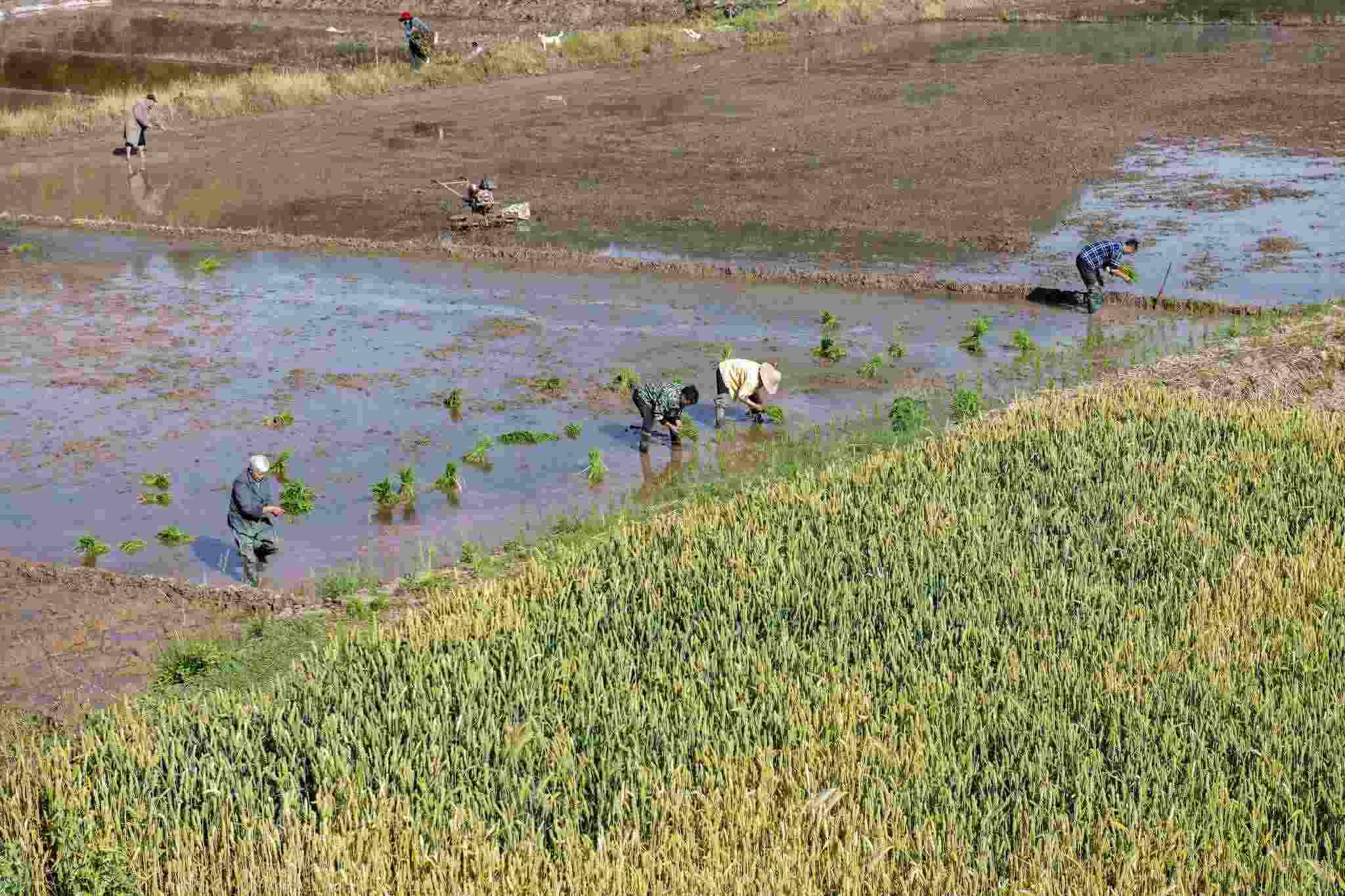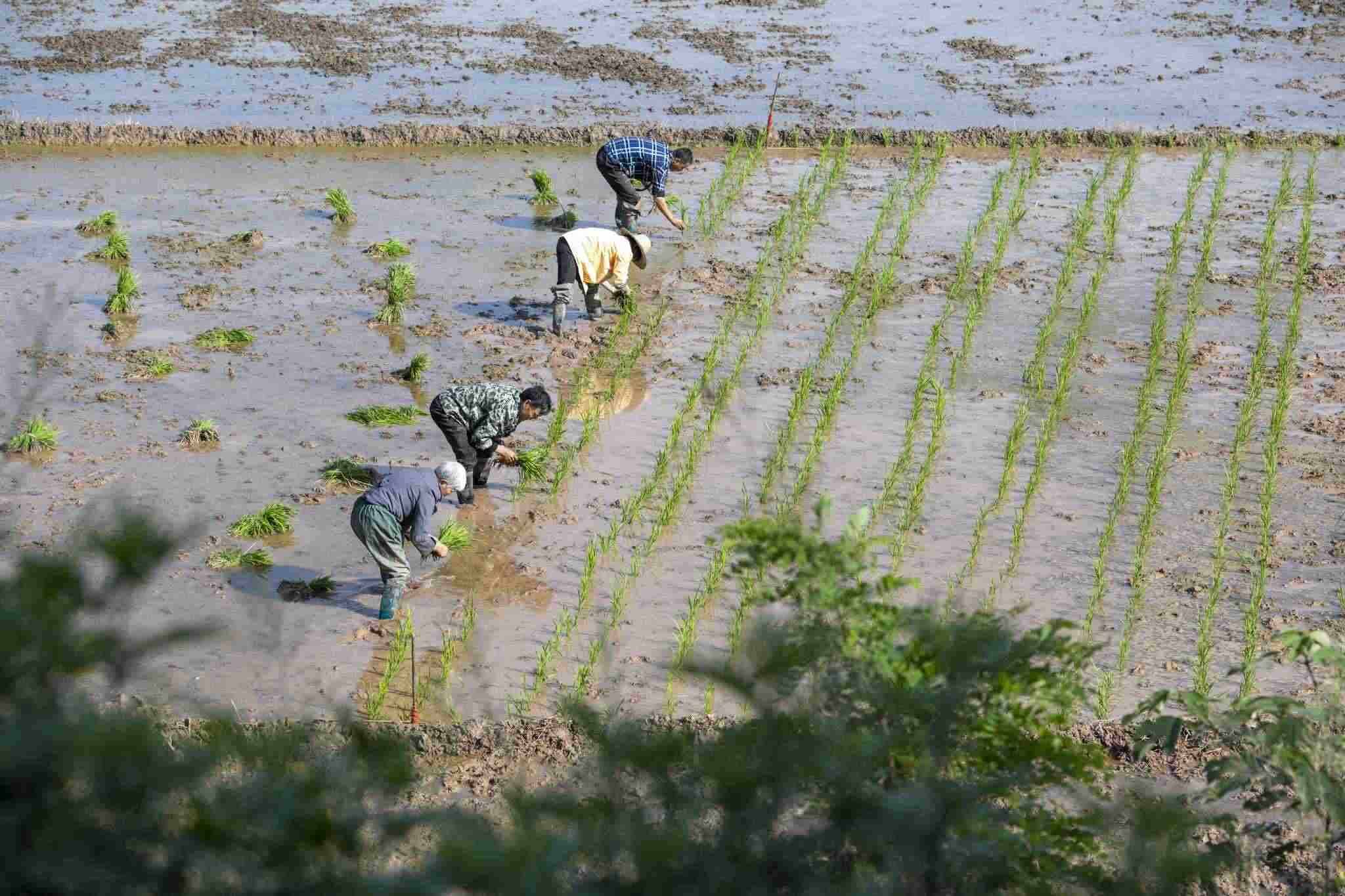 2023年4月30日,四川閬中,暮春時節(jié),村民在囤水田栽插早稻,處處可見搶抓農時的忙碌身影。視覺中國