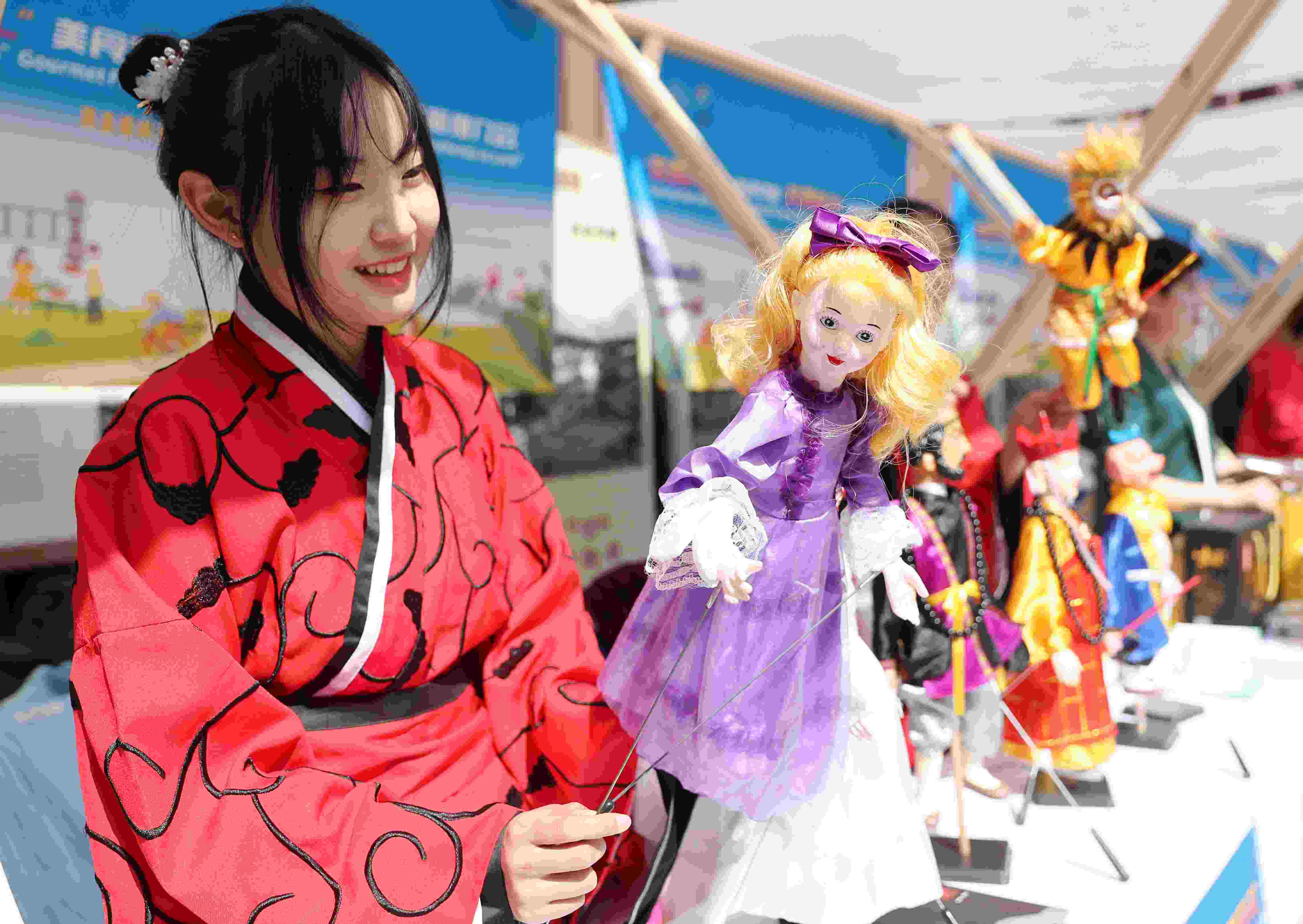 4月30日,山東萊西木偶藝術(shù)團(tuán)的演員在給游人們展示木偶戲的表演技巧。 張進(jìn)剛 攝