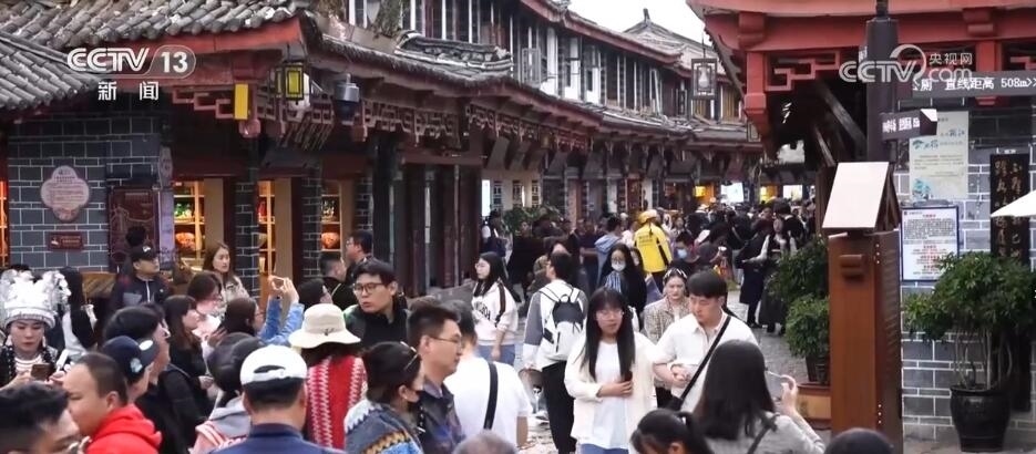 總臺(tái)記者 郭琳潔:“五一”假期第三天,臨近中午,麗江古城已經(jīng)是人流如織。游客有的是一家老小有說(shuō)有笑,有的是三五好友打卡拍照。陽(yáng)光明媚的上午,漫步在古香古色的四方街,探訪小橋流水人家,非常愜意悠閑。商家們?yōu)榱擞佑慰鸵沧鲎懔藴?zhǔn)備,各種特色工藝品、熱氣騰騰的美食隨處可見(jiàn),還有民族特色的歌舞表演,讓大家感受納西族傳統(tǒng)文化的魅力。