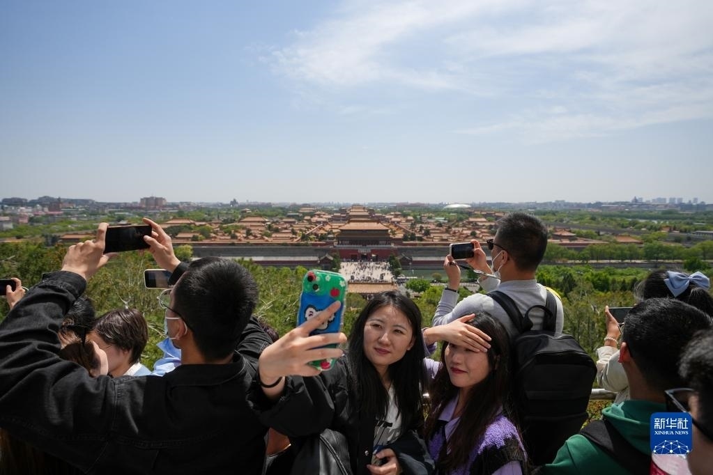 4月29日,游客在北京景山公園登高賞景拍照。