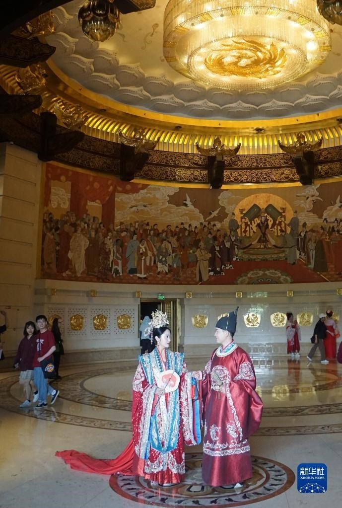 5月1日,兩名古裝愛好者在河南洛陽(yáng)隋唐洛陽(yáng)城國(guó)家遺址公園留影。