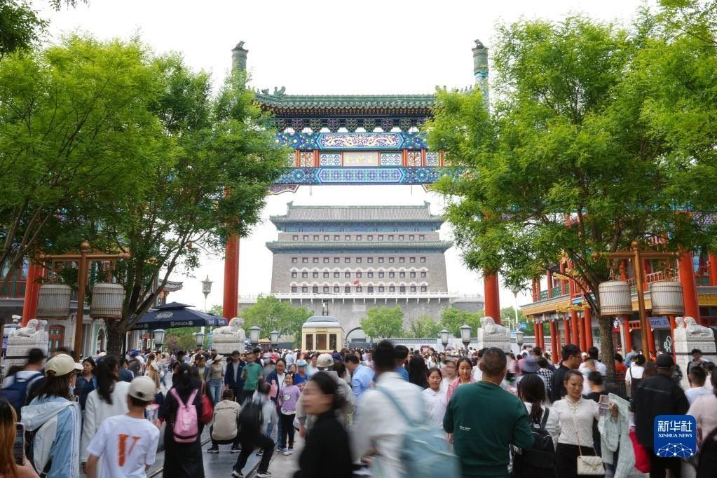5月1日,游客在北京前門大街參觀游覽。