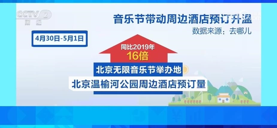4月29日—5月1日,北京草莓音樂節(jié)舉辦地延慶世園公園周邊的酒店預訂量,同比2019年增長18倍。4月30日—5月1日,北京無限音樂節(jié)舉辦地北京溫榆河公園周邊酒店預訂量,同比2019年增長16倍。