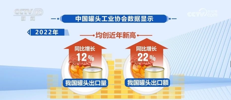 來自中國罐頭工業(yè)協(xié)會的數(shù)據(jù)顯示,近年來,中國罐頭在海外熱銷,出口量持續(xù)躍升。2022年,我國罐頭出口量和出口額同比分別增長了12%和22%,均創(chuàng)近年新高。中國已經(jīng)多年位居罐頭生產(chǎn)和出口第一大國,產(chǎn)量約占全球的四分之一。